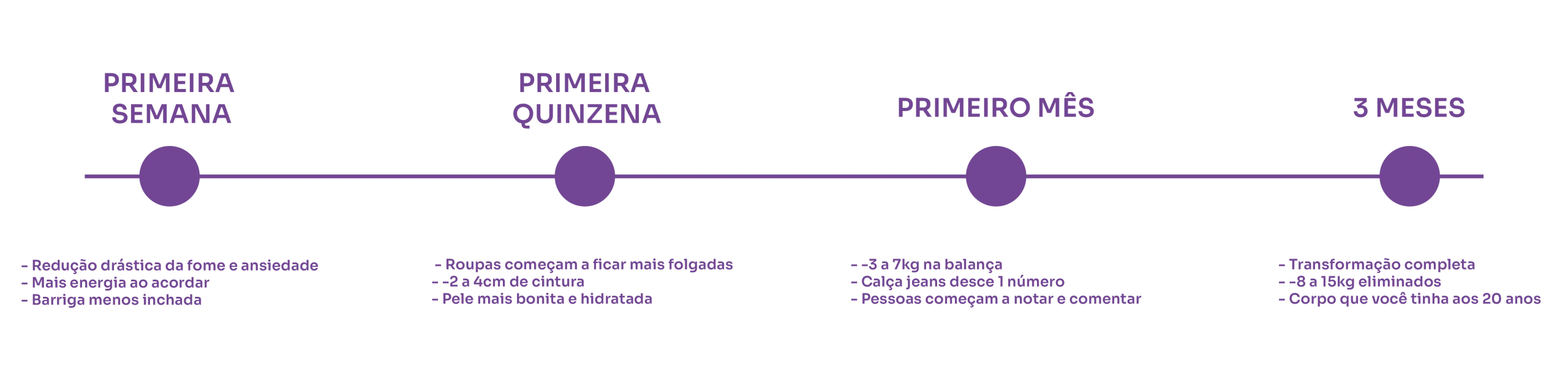 A maioria das mulheres nota diferença já na primeira semana: barriga menos inchada, mais energia e menos fome. Em 30 dias, a média é de 3-7kg eliminados. Em 3 meses, transformação completa.